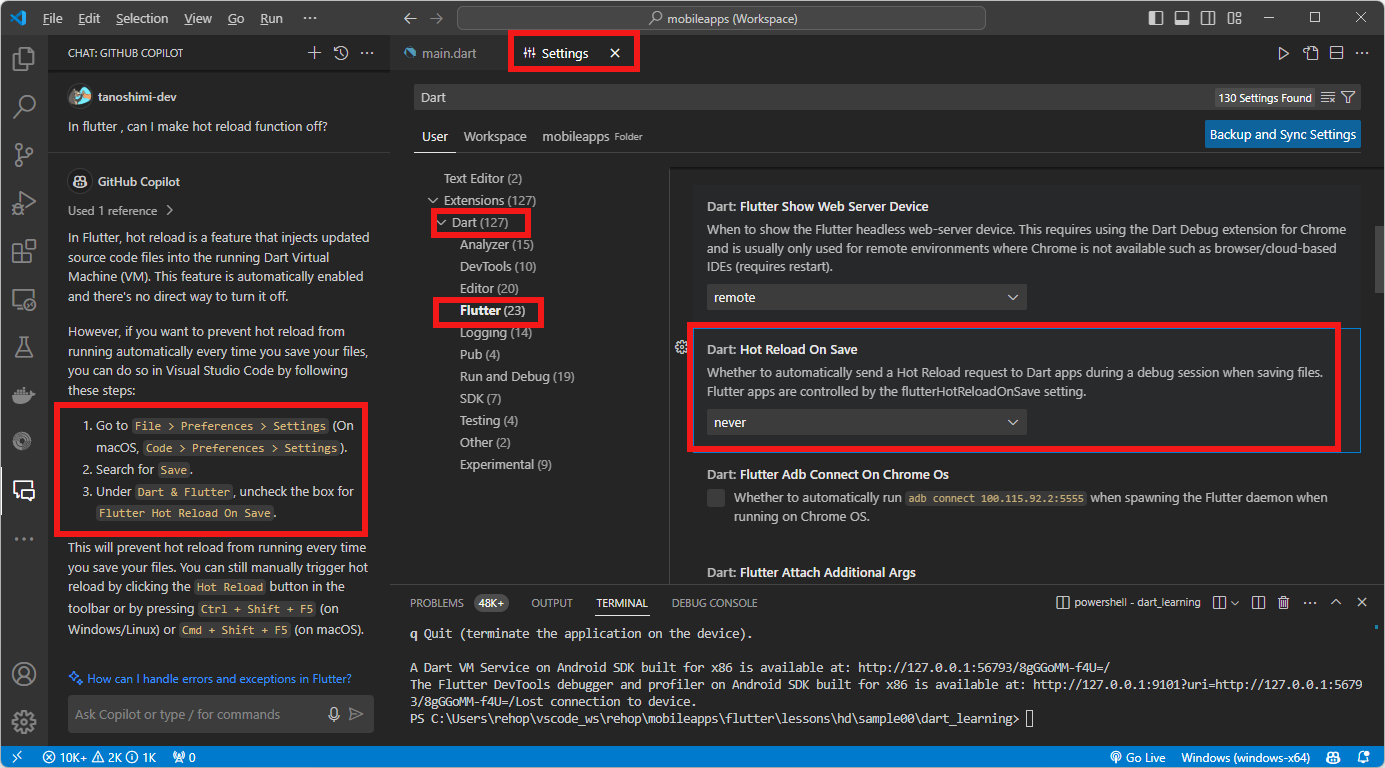 Flutterは、開発効率を上げるため、アプリ起動中にプログラムを修正すると、修正内容がアプリに即時反映される "hot reload" 機能を持っています。