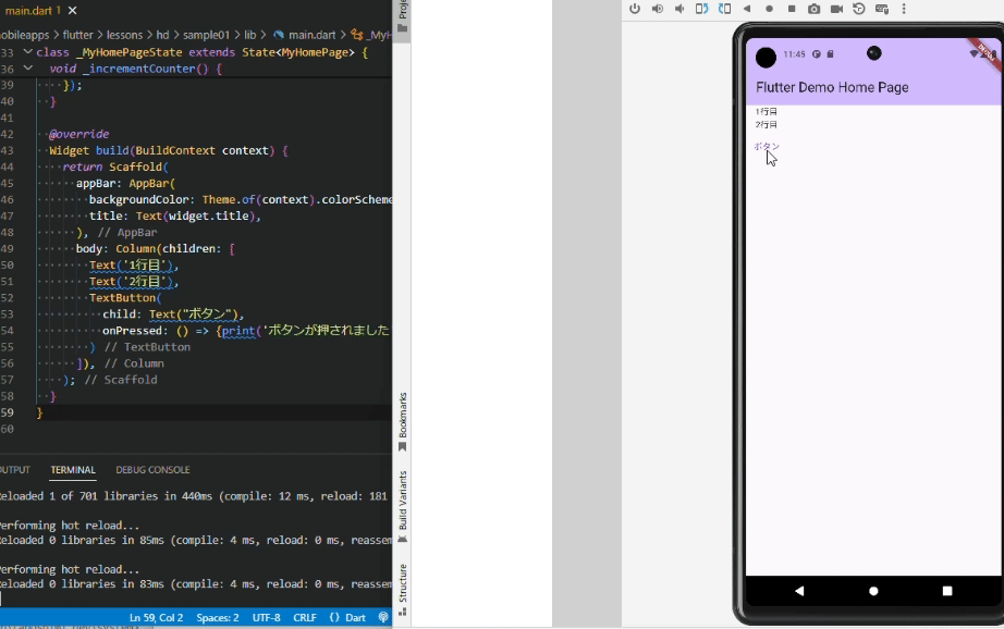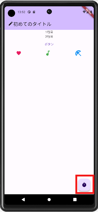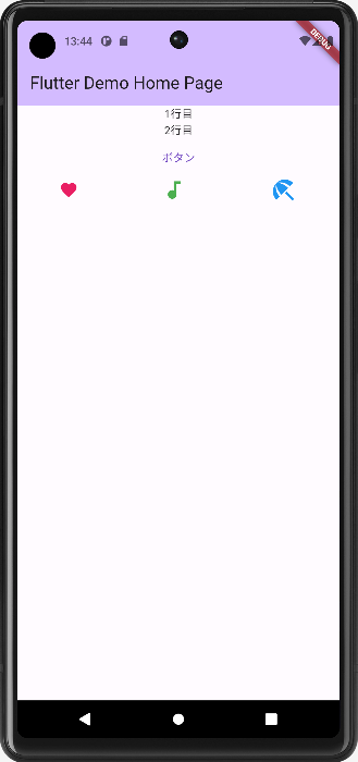 3行目にボタンが配置されました。 TextButtonでは、onPressedとchildの2つの要素を指定しています。 onPressed は、ボタンが押された時のイベントを設定するものです。今回はシンプルにターミナルに文字列を表示するようにしています。childには、画面上に表示する文字列(TextのWidget)を指定しています。 画面上のボタンをタップするたびに、ターミナルに「ボタンが押されました」の文字が表示されます。4行目に3個のアイコンを配置する