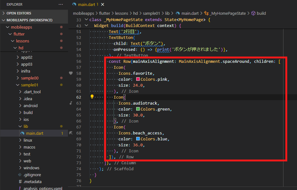 4行目に3個のアイコンが増えました。Rowは横にWidgetを配置する「列を実現するWidget」です。childrenに配列で3つのIconを与えています。