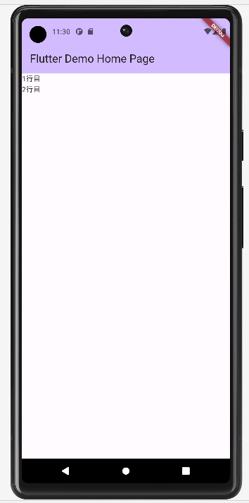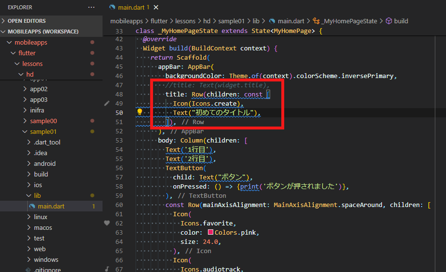 titleに設定されているRowは、先程アイコンを横に並べたところで使ったものと同じで、1行に複数のWidgetを表示するために用いています。