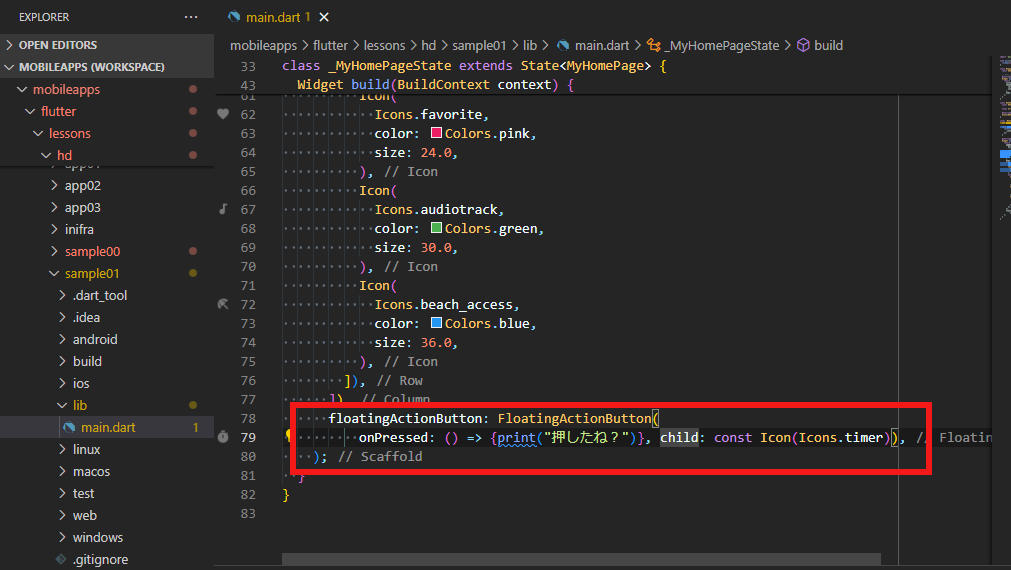 右下に、タップするとターミナルに文字列が出力されるボタンを作れました。onPressedはTextButtonのところでも出てきましたが、ボタンが押された時に呼ばれるイベントです。
