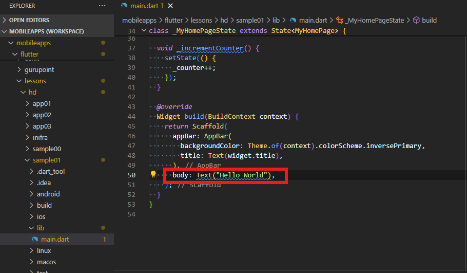 flutter create sample01コマンド実行後、sample01フォルダが自動生成され、その中にデフォルトのアプリが作成されます