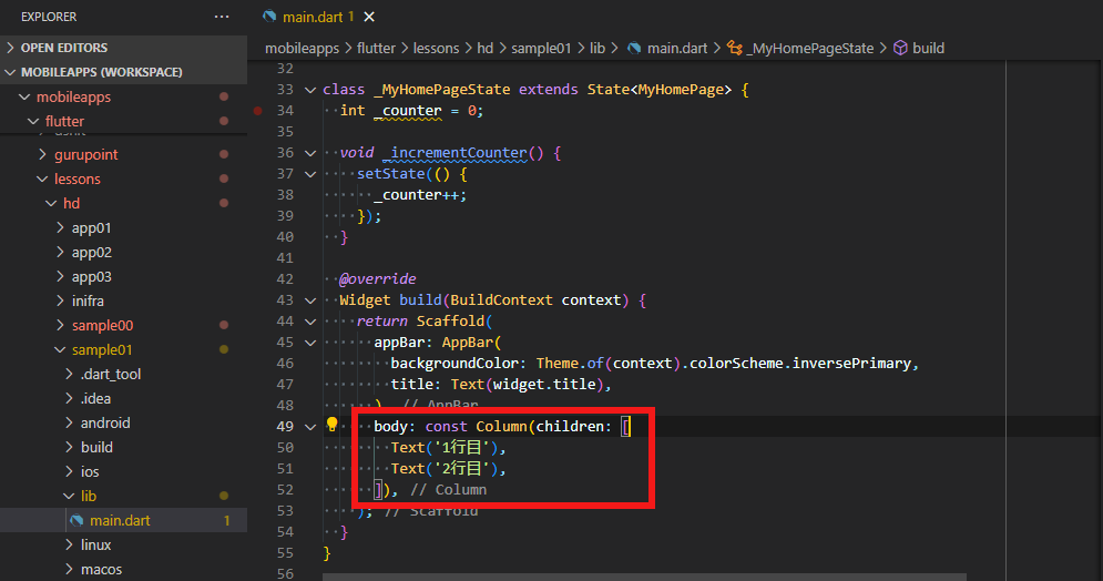 bodyに、直接Textを2つ配置することはできないので、「Widgetを縦に並べる」ColumnというWidgetをbodyに設定し、Columnの下に2つのTextを配置します。Columnは縦にWidgetを配置する「行を実現するWidget」です。childrenにどのWidgetを並べるかを配列で指定します。今回は2つのTextがColumnの子要素となります。