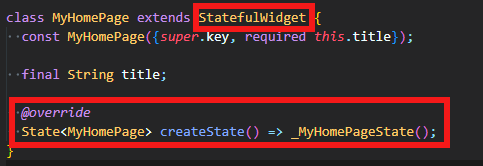 StatefulWidgetクラスで定義されたcreateState() で、1つ前のコード部分の状態(State)クラスを生成し、StatefulWidgetの状態を設定します。