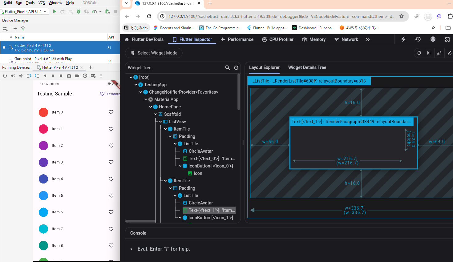 Flutter プラグインを開くと、現在選択しているdartファイルのクラス構成がツリー表示されます。